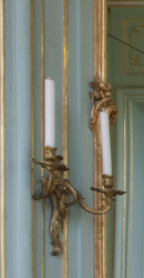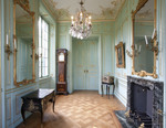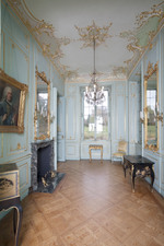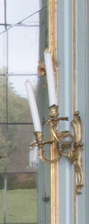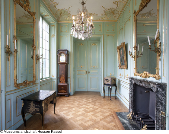 Spiegel mit der Wand verschraubt. Reiches Rocailleornament von scharfen Formen. Die Unterseite um ein liegendes Rocailleornament symetrisch entwickelt, die obere Seite auch in dem nach vorne gerichteten Mittelornament symmetrisch. Die Mitte der Seiten durch Rocaillen betont.