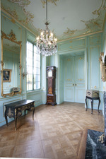 Tief gekehlt und im Relief der Bekrönung und des unteren Mittelstückes reich entwickelt. An der Bekrönung die geflügelte Rocaille, die sonst fast nur in Postdam vorkommt. Vergoldungsübergang. Oben Blüten.