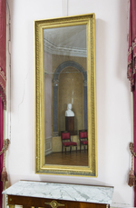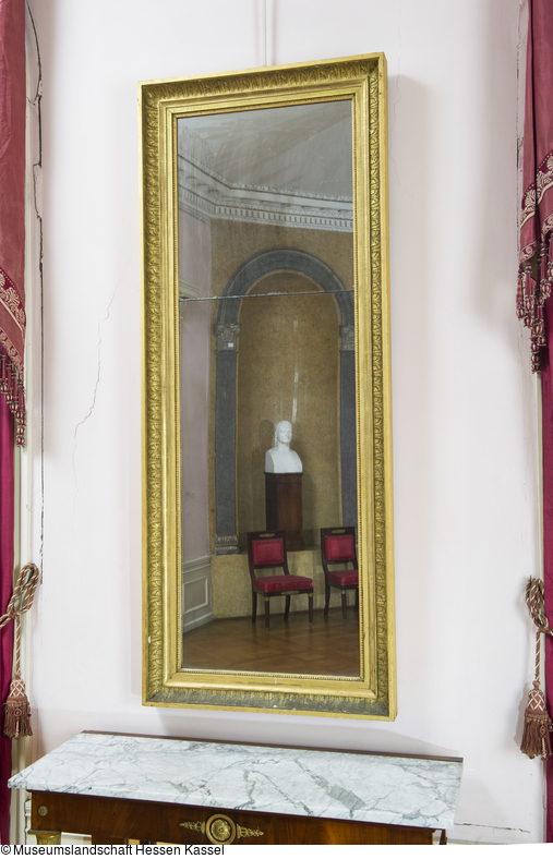 Hochrechteckiger Wandspiegel in vergoldetem Profilleistenrahmen mit Reliefauflagen. Am äußeren Rand umlaufend steile Kehle mit aufgelegtem Akanthusblattfries. Daran anschließend kleine, flache Kehle, glatte Zwischenzone und am inneren Rand kleiner stilisierter Blattfries.