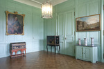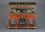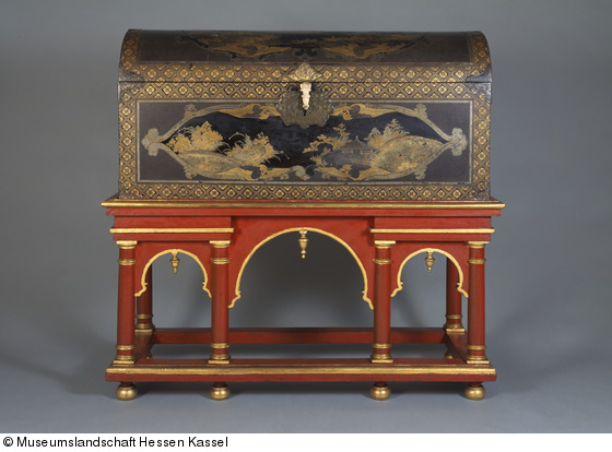Die Truhe mit halbrund gewölbtem Deckel und seitlichen Tragegriffen. Die Truhe wird auf allen Seiten eingerahmt von einem breiten Shippo-Muster (sich überlappende Kreise mit Blütenornament in der Mitte shippo-tsunagi) in Gold- und Silber-Hiramakie, was stark an japanische Perlmuttlacke für den Export erinnert, sowie von einem breiten Silberband. Deckel und Vorderfront krönt eine große Kartusche auf bereits stumpfem und abgeriebenen Gold (Kinji-) Grund. Die Kartusche wird oben und unten eingerahmt von zwei sich gegenüberliegenden Phönixen mit ausgebreiteten Flügeln, deren Schwanzfedern seitlich in eine florale Ranke überlaufen und den seitlichen Abschluß bilden. Die Frontkartusche zeigt links in leichtem Relief eine sanfte Hügellandschaft mit Päoniensträuchern, rechts eine hügelige Landschaft mit einem Pavillon vor einer Kiefer-, Ahorn- und Tannengruppierung. Die Szene ist in Gold- und Silber-Hiramakie bzw. -Takamakie sowie vereinzelten unterschiedlichen großen Bleieinlagen (Uemono) ausgeführt, vor einem schwarzlackierten Hintergrund. Die Deckelkartusche ziert eine Seenlandschaft mit einem langgestreckten Gebäudekomplex. Technik wie oben. Neben kleinen fehlenden Bleieinlagen auch eine große, sehr tiefe Fehlstelle. Auf der Truhenrückseite eine längliche achtpassige Kartusche mit blühenden Clematisranken. Die Deckelseiten schmückt die Frontansicht eines kauernden Kaninchens mit seitlich ausgestreckten langen Ohren. Der Unterleib ist silbern, der obere Körper in Gold gearbeitet. Auf der linken Truhenfläche eine vierpassige breite Kartusche mit von Schmetterlingen umschwirrten Nelkenbüschen hinter einem niedrigen Zaun. Vielleicht eine abgewandelte Anspielung auf das berühmte Motiv ''Chrysanthemen am Ostzaun'' nach einem Gedicht des chinesischen Dichters T'ao Yüan-ming (365 - 427). Auf der rechten Truhenseite eine Landschaft mit Herbstblumen. Die Truheninnenfläche ist vollständig schwarz lackiert und trägt lediglich auf der Deckelinnenseite eine Asternstaude mit Schmetterlingen. Die Truhe besitzt kunstvoll geformte und ziselierte Beschläge und Griffe in vergoldetem Messing. Die seitlichen Tragegriffe sitzen auf vierblättrigen, eingravierten Rosetten auf dem oberen Kartuschenrand. Die Vergoldung der Griffe ist abgerieben und zeigt blankes Messing. Als Dekor ein wappenartiges Ornament von 7 Augen und gepunktetem Rankenwerk. Die Schutzbeschläge an den Kanten sind dreieckig und laufen in dekorative Wolkenkopfformen (yün-t'ou) aus. Leicht erhaben liegen Päonien mit arabeskem Rankenwerk auf der Oberfläche. Das Meisterstück des Kunstschmiedes ist neben dem Deckelscharnier, einem Messingstreifen, der in Wolkenkopfmuster ausläuft und mit einem runden Wirbelmotiv (To-mo-e) und Schmetterlingen ziseliert ist, der Schloßbeschlag. Seine Außenlinie endet in acht Wolkenköpfen. Auf der Innenfläche aus getupften Quadraten eine achtpassige Kartusche mit Bergen, Häusern und Glyzinien.