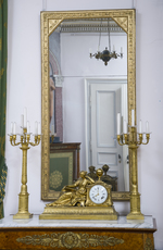 Hochrechteckiger Wandspiegel in vergoldetem Rahmen mit geschnitzten Auflagen. Die Rahmenleiste am äußeren Rand gekehlt, dann folgt auf eine erhöhte Randzone ein umlaufender Fries aus aneinander gereihten Blättern.