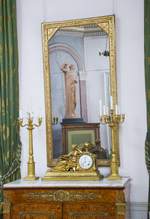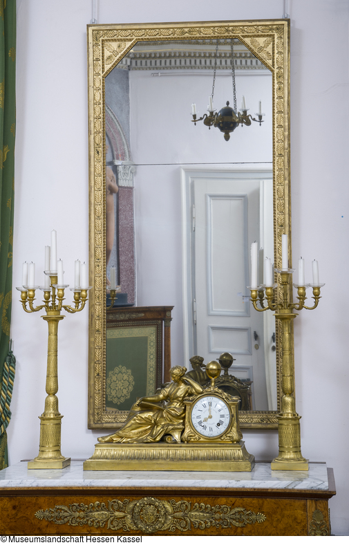 Holz, geschnitzt, Matt- und Glanzvergoldung, Nadelholz, Spiegelglas, zweiteilig |