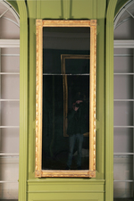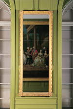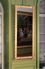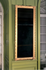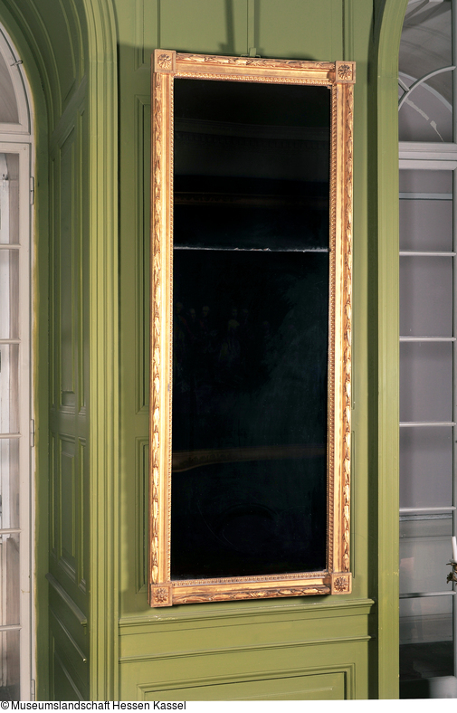 Zweiteiliger Spiegel mit geschnitztem, vergoldetem Rahmen. Profilleiste mit umlaufendem Lorbeerblattfries am äußeren Rand. Zum inneren Rand hin einmal abgesetzt mit umlaufendem stilisiertem Blattfries. Eckquadrate mit leicht vertieften Feldern, in denen Rosetten sitzen. Rückseite holzverkleidet aus einer Rahmenkonstruktion mit Füllungen.