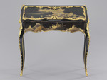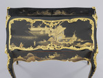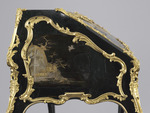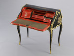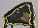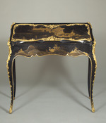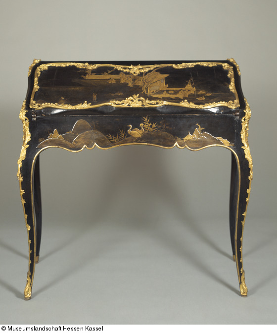 Schreibtisch in Eselsrückenform (en dos d'áne secrétaire en pente) auf geschwungenenen schlanken Beinen. Geschweifte Zarge, darüber aufklappbare Schreibplatte. Eichen- und Tannenkorpus z.T. furniert und mit französischem und japanischem Lack versehen. Malerei und Relieflack in Gold auf schwarzem Grund versehen. Auf der Schreibplatte außen japanischer Lack mit europäischen Ergänzungen und Überarbeitungen: Darstellung eines Wohnhauses mit Gartenlandschaft. Im Garten und auf der Terasse gruppieren sich jeweils drei Figuren, von denen einige eine Szene im Vordergrund beobachten: einen sitzenden Mann, der einen Affen dressiert. Die Darstellung durch einen Baum zentriert. Der japanische Lack ist bei Gewandmustern und Details sehr fein gezeichnet, hat jedoch durch Überlackierungen gelitten. Die Deckplatte, Zarge und die Seitenteile sind aus asiatischen und französischen Lackarbeiten zusammengesetzt: Landschaftsdarstellungen und Vögel. Die Platte durch feuervergoldete Beschläge mit Rocaillen und Blütenranken gerahmt; die Seiten und Kanten der Beine mit Blattranken. Im Innern geschweifte Schubladen und Fächer, dreireihig angeordnet, zwei Schubladen links als Geheimfach zusammengefaßt. Rechts drei kupferne, ''versilberte'' Schubladeneinsätze für Schreibutensilien. In der Mitte verschiebbare Platte, unter welcher ein schwarz lackiertes Fach liegt, das mit einfachen Ornamenten nachträglich bemalt wurde. Die Schreibplatte innen mit grünem Leder neu bezogen.