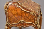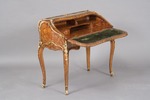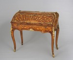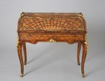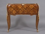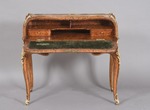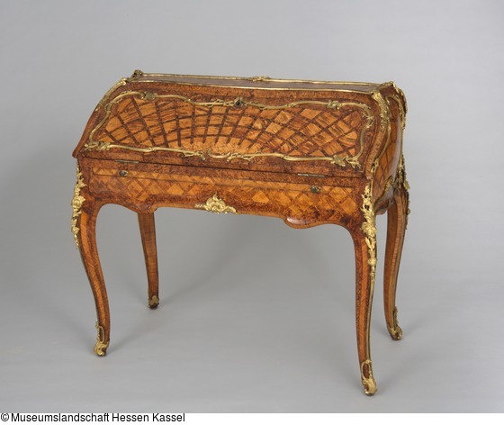 Hochbeinig, in Grund und Aufriss geschweift mit plüschbeschlagenem Auszug u. ebensolcher Klappe. Eselsrückenform. Die Flächen mit Vergatterung, radial aufgeteilten Kreisbögen in Erlenwurzel- u. Birkenfurnier auf Eiche. Der geschweifte u. ausgebogene untere Rand mit Furnierfase, die in grosser Linie auch an den Beinen weiter läuft. Flächen in Bronzerahmenwerk gefasst: flach polierte schmale u. belaubte Ranken, die sich an den Ecken u. in der Mitte in Muschelkartuschen auflösen. Beine mit Eckschienen, Bronzeschuhen u. Blumenkartuschen auf den kurvierten Ansätzen. Im Innern Fächer u. Schubkästen in zwei Reihen, alles mit Erlenwurzelfurnier. Außen seitlich zwei verschliessbare Schubladen.