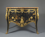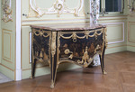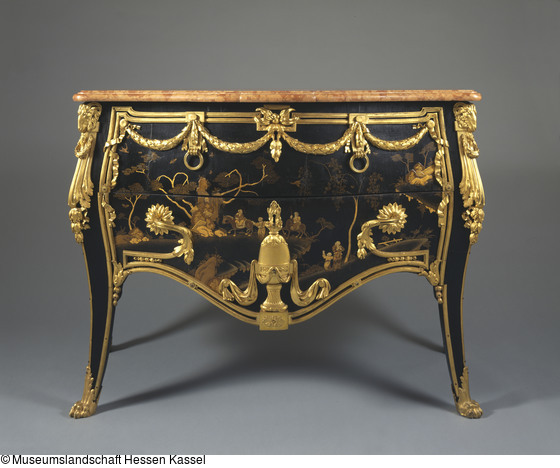 Eine von zwei Kommoden mit Eichen- und Lindenkorpus. Geschwungene Form auf ausgestellten Beinen, weit herabgezogene Schürze, zwei Schubladen. Furnierte Vorder- und Seitenteile mit französischem Vernis Martin nach chinesischen Vorbildern lackiert. Auf schwarzem Grund Malerei in verschiedenen Braun- u. Goldtönen mit, roten und silbernen Details: Pittoreske Szenen in Fels- bzw. Seelandschaften.