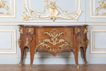 Die vier Beine mit Akanthusschuhen. Die Seitenflächen mit einem stehenden und einem stürzenden Amor zwischen Wolken belegt. Am seitlichen Abschluss zwei stark modellierte Amorettenköpfe in Wolken- und Rocailleformen mit vegetabiler Verkleidung. Die Tischlerarbeit und Bronzen von gleich hoher Qualität.