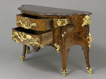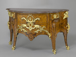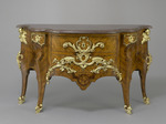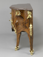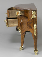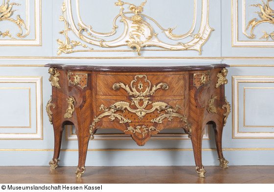 Kommode von sehr breit ausgezogenem, geschweiftem Grundriss mit zwei Mitteischubladen und je einer kleinen Seitenschublade, die oberhalb der inneren Beine sitzen. Die vier Beine gehen seitlich in schlüssellochartig geschweifte Einschnitte in die Zarge über. Durch die starke Abfasung der beiden inneren Beine erhalten diese einen flachen siebenkantigen Grundriss. Sie schwingen über einem Knie rückwärts nach den kleinen Schubladen hin, die herausgewölbt sind. Die hinteren Beine sind an den Seitenkanten ungleich profliliert, im übrigen ebenso wie die Vorderbeine im Wechsel von ausgehöhlten, gewölbten und glatten Flächen gearbeitet. Mamorplatte in tiefrotem, in sich gemusterten Marmor mit reichprofiliertem Rand. Holzarbeit im Gestell unter Verwendung von weichem Holz, die Schubladen auf Nussholzkern. Die Furnierung in dreierlei rotbraunem und einem fast schwarzem Holz.