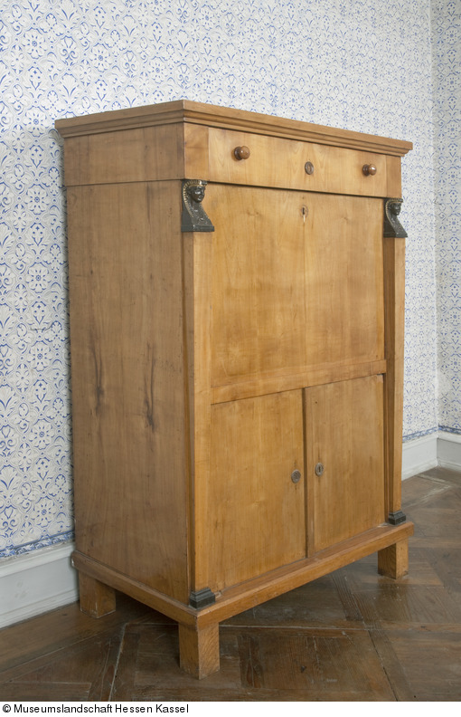 Kiefernholz und Kirschbaumfurnier, Schreibklappe an 2 eisernen Scharnieren herunterklappbar, 14 Zugknöpfe und 1 Schlüsselschild aus Messing, 2 gedrechseIte hölzerne Zugknöpfe, 2 Schlösser, 2 Schlüssel, 2 Schmuckteile in der Form von Sphinxen und 4 runde Schlüsselschilder aus Papiermache.