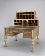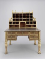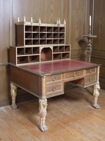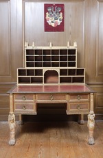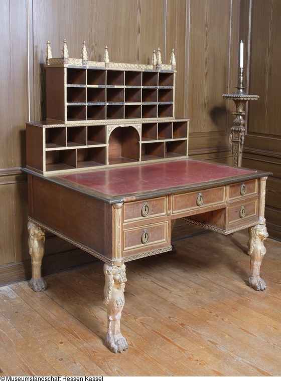 Fünfschübiger, offener Schreibtisch auf vier löwenförmigen Stollen. Die sichtbaren Teile in Eiche gearbeitet, teilweise gefaßt und vergoldet; das übrige Korpus aus Weichholz. Die Löwenbeine auf je einer kräftigen, wohlmodellierten Tatze, die nach oben in eine Wade übergeht. Diese behaarte Wade ist gleichzeitig die Brust eines Löwen mit langer Mähne. Alle Beine in Polimentvergoldung mit rotem Bolus. Karyathidenhaft tragen diese Löwen die Eckpfosten des Möbelkorpus, denen wiederum halbierte, vergoldete Bündelpfeiler vorgelegt sind. Die Front dazwischen symmetrisch gebildet. Neben der mittleren Schublade, zwei übereinander liegende schmalere Schübe von enormer Tiefe. Vorne jeweils ein vergoldeter Profilrahmen; um die Schlüssellöcher hochovale Beschläge mit nicht ganz klar gekennzeichneten Ordenskreuzen. Darüber ein kleiner Löwenkopf mit einem Ring im Maul, der über den Beschlag herabfällt und ihn umschließt. An der Unterkante des Korpus umlaufendes Gesims mit einer eingelegten Kette von eckigen Gliedern, die durch Bünde abgeschnürt werden. Die verhältnismäßig tiefe Schreibplatte in massiver Eiche mit eingelegter Schreibfläche aus rotem Leder (ursprünglich schwarz). Nach hinten eine Fläche zur Platzierung der Reposituren (Inv.Nr. 2.7.623; 2.7.624). Die Platte umlaufend abgerundet und mit einem Messingband beschlagen.