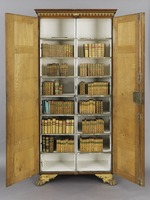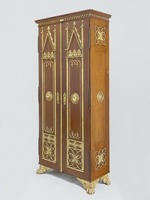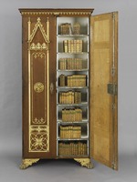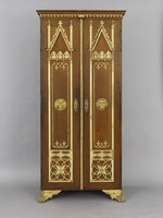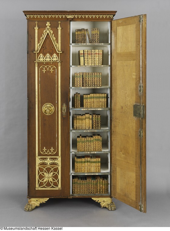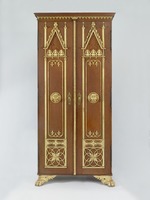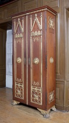 Hoher, schmaler, zweitüriger Aktenschrank aus Eichenholz auf vier geschnitzten Löwenfüßen, die in große Blätter übergehen. Der Schrank ist ohne Rahmen in Brettbauweise konstruiert, die Seitenwände sind dagegen als Rahmen mit kaum merklich vertieften Füllungen gebaut. Die Wirkung des Schranks ergibt sich aus der holzsichtigen glatten Eiche und den sämtlich vergoldeten Ornamenten. Die zweitürige Fassade symmetrisch an der Anschlagleiste gespiegelt. Letztere mit einem Band von schuppig übereinander gelegten Blumenmedaillons, das sich von der Mitte ausgehend in zwei Richtungen entwickelt. Den Türen selbst ist eine vergoldete Maßwerkkonstruktion vorgeblendet. Es handelt sich um einen dreigeschossigen schlanken Aufbau mit einem wimpergartigen Giebel und je zwei Fialen. Im Sockelbereich stehen ineinander geschlungene, aus Zirkelschlägen konstruierte Vierpässe mit einer aufgelegten Kreuzblume. Es folgt eine Ornamentzone von gerahmten Kreuzblumen und dann ein hohes Feld mit einer Rundstabrahmung, welche oben und unten mehrpassig ausläuft und mit über Kreuz angebrachten Blättern belegt ist. Im Zentrum des Feldes ein Medaillon mit einem stark plastisch geschnitzten Löwenkopf; vergleichbar der Anbringung an mittelalterlichen Kirchenportalen, jedoch ohne Ringe. Das obere Giebelfeld an der Sockelkante mit drei spitzbogigen Feldern darin jeweils ein kleiner Zweig mit dreipassigen Blättern steht. Das Giebelfeld selbst in vertieftem Blendmaßwerk angelegt, jedoch unter Verzicht auf weitere Goldhöhungen. Der obere Abschluß in der Art eines krabbenbesetzten Wimpergs der von einer Kreuzblume bekrönt und von zwei schlanken schmucklosen Fialen flankiert wird. Das nicht besonders weit auskragende Kranzgesims des Schrankes mehrfach profiliert und von einem vergoldeten Maßwerkfries begleitet. Auf der Seite des Schranks oben und unten die Wiederholung der Zirkelschlagpässe der Vorderfront; hier jedoch in leicht variierter Linienführung der Linien. In der Mitte der Seitenfläche eine filigran durchbrochen geschnitzte Blumenrosette, der wiederum eine Zirkelkonsruktion zugrunde liegt.