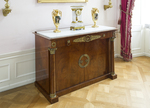 Niedrige, glatte und geschlossene Sockelzone, etwas über den Korpus vorkragend. Quadratische Vorsprünge an der Vorderseite, die als Podeste für die freistehenden Säulen der Front dienen. Basen und Kapitelle der Säulen mit vergoldeten Bronzebeschlägen: Basen mit stilisierten Blattfriesen, Kapitelle mit zweireihigem Akanthusdekor und teils vollplastisch gearbeiteten Voluten.