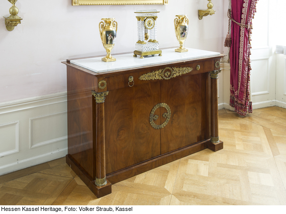 Über den Türen ein von den Säulen getragener Architrav, der eine Schublade birgt. Die Schubladenfront mit Bronzebeschlägen: mittig in einem Rosenkranz Schlüsselschild analog zu den Türen, davon ausgehend reicher Beschlag aus Rosenblüten und -blättern. Seitlich je eine Löwenkopfmaske, im Maul einen Ring tragend. Über den Kapitellen je ein Beschlag aus Rosenblüten und -blättern.