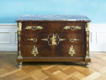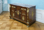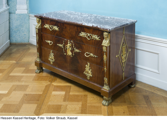 Kommode mit drei gleich hohen Schüben und reichem Bronzebeschlag. Der Sockel ruht vorne auf vergoldeten Löwenfüssen, hinten auf Klötzen und vergoldeten Kugeln in gedrückter Form. Links und rechts der Frontseite von der Sockelzone bis zur marmornen Deckplatte verkröpfte Vorsprünge mit je einer Herme und aufwendiger vergoldeter Metallapplikation: unten blattverzierte Basis, oben Sphinxkopf, auf dem Hermenpfeiler mehrteiliger Kandelaber mit Puttenpaar, Kugel, Panherme und Adler. Auf den drei Schüben wechselnde Applikationen aus vergoldetem Metall: unten zwei gegenständige Sphingen; mittig links und rechts Schlangengriffe und Blattkartusche, in der eine nach links tanzende Flora mit Blumengirlande sowie rechts von ihr ein Schlüsselloch vorhanden sind; oben links und rechts je zwei gegenständige Genien, dazwischen bewegliche Lorbeerblattkränze als Griffe an Schleifen. Glatte Seitenwände der Kommode mit großer applizierter Rautenkartusche, darin Lyra mit Rosette und Blattwerk. Rotbraune Marmorplatte mit grau-weißer Äderung.