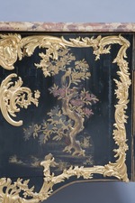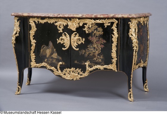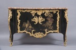 Blindholz Eiche, Linde u. Rüster, z.T. furniert, französicher und japanischer Lack, Türen innen: Ebenholz u. Palisander, feuervergoldete Bronzebeschläge, Marmorplatte |
