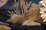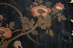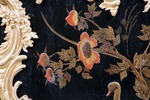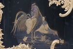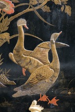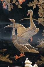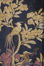 Japanische Lackmalerei und -relief, Goldstreutechnik auf den Türen: Gold, grünliche, bläuliche, graue und rote Töne auf schwarzem Grund. Auf der linken Tür Hahn und Henne mit Küken; auf der rechten Tür ein Baum mit Glockenblumen- und Päonienblüten, in dem ein Paradiesvogel sitzt.