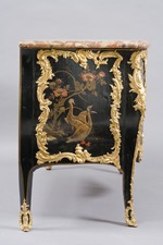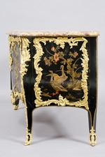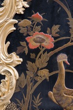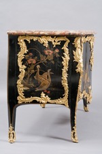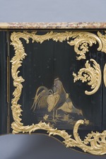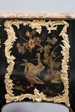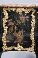 Auf beiden Seiten der Kommode sind spiegelbildlich Gänsepaare unter Päonienzweigen in europäischer Lacktechnik auf asiatischem, überfaßtem Lackgrund dargestellt. Es handelt sich dabei um französische Kopien nach den asiatischen Lackarbeiten der beiden Eckkommoden Inv. Nr. SM 2.5.92 und SM 2.5.93.