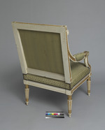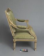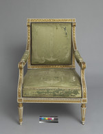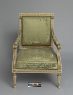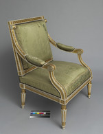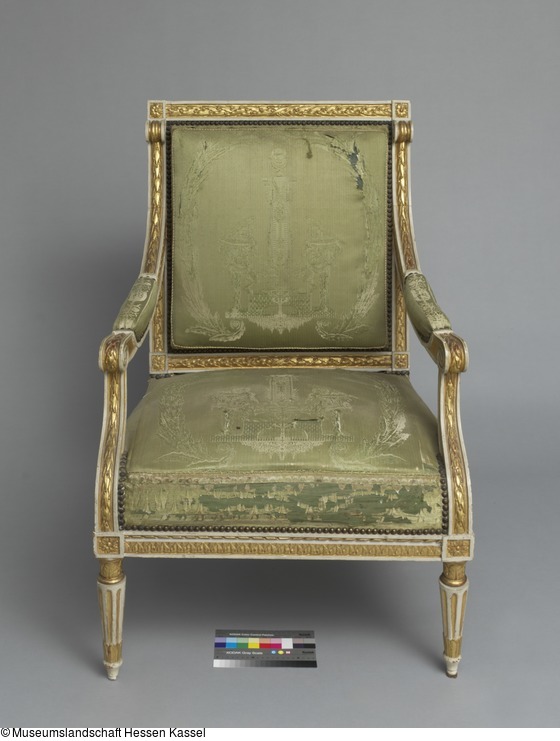 Einer von zwei weiß-gold gefaßten Armlehnsesseln. Kannelierte Rundbeine, nach unten leicht konisch zulaufend. Im unteren Bereich mit aufgelegten lanzettförmigen Blättern. Abgesetzte Fußzone. Zum Zargenansatz etwas eingezogen mit stark stilisierten Palmettenblättern. Gerade Zarge mit aufgelegtem Blattfries, darüber ein Hobelspanfries. Die Ecken durch Quadrate mit Rosetten betont. Rahmen der Rückenlehne mit Fries aus Lorbeerblättern und -früchten, die Ecken mit gerahmten Rosetten. Die Seitenteile der Rückenlehne mit Hobelspanfries. Sitz und Rückenlehne gepolstert und mit grünem Seidenstoff bezogen. Das die Fläche jeweils ganz ausfüllende Webmuster zeigt zwei bärtige Männer, eine Keule ? schwingend, (Herkulesfiguren ?), seitlich eines von einer Vase gekrönten Pfeilers. Der Pfeiler wächst aus Blattformen hervor und wird von einem Blattkranz gerahmt. Die Armlehnen mit Muster aus stark stilisierten vegetabilen Motiven.