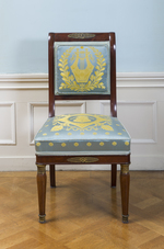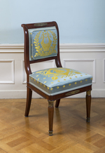 Gepolsterter Stuhl auf zwei keulenförmig gedrechselten Vorderbeinen mit bronzenen Füßen und Blattkapitellen. Vierkantige Hinterbeine, die nach hinten ausschwingen. Schmale, an den vorderen Ecken gerundete Zarge, oben und unten mit Profilleisten. Trapezförmiger Polstersitz. S-förmig geschwungene Rückenlehne mit quadratischem Polster. Das Lehnenhaupt schwingt nach hinten aus und ist mittig wie die vordere Zarge mit einem Bronzebeschlag versehen: schleifengebundene, gekreuzte Pfeile in einem Blütenkranz, der von Blütenzweigen flankiert wird. Polsterbezüge aus hellblaugrundigem Seidendamast mit zwei großen gelben Motiven, die von einzelnen Palmettenblättern umgeben sind: auf der Rückenlehne eine Lyra, die von zwei Lorbeerzweigen gerahmt wird, auf dem Sitzpolster zwei gegenständige Schwäne in einer Rautenkartusche, umgeben von Ranken, Blattwerk und Schleifen.