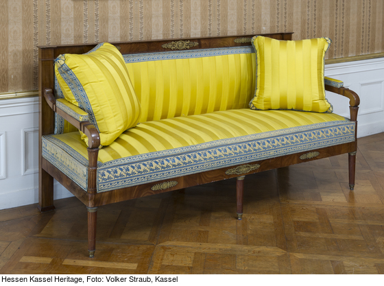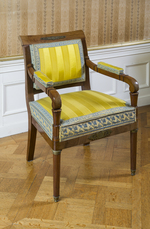 Gerade, erhöhte Rückenlehne mit leicht vorkragendem Abschluß. Das Lehnenhaupt mit 3 Bronzebeschlägen: mittig Medusenhaupt in einem Kranz, seitlich davon je ein Paar Füllhörner mit Blattstäben. Die beiden seitlichen Beschläge analog zu den seitlichen Beschlägen der Zarge. Sitz, Armlehnen und Rückenlehne gepolstert und mit gelb-gestreiftem Seidenstoff bezogen. Borte aus stilisierten Lotosblumen und Blättern. Rückseite mit Leinenstoff bespannt.