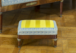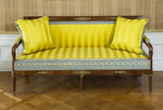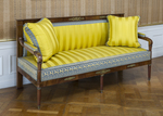 Mahagoni furniert und massiv; Eiche, Buche, Bronze, vergoldet, gepolstert, Seide, gelb-gestreift, Borte blau-gelb mit Lotosblüten und Blattmuster |