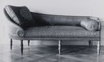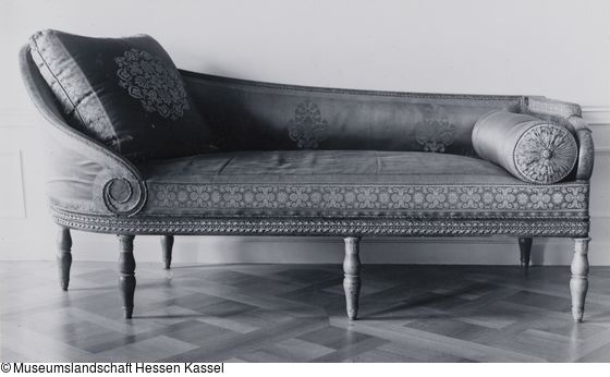 Ruhebett auf sechs Doppelbalusterbeinen mit Bronzeschuh, Blattkapitell und Perlstab. Glatte Zarge mit einer im Uhrzeigersinn umlaufenden bronzenen Weinblattranke, die oben und unten von Mahagonileisten gerahmt wird. Auf der linken Seite halbkreisförmig gepolstertes erhöhtes Kopfteil, das im oberen Bereich nach außen schwingt und vorne in einer Volute endet. Rückwärtig geht das Kopfteil in die gepolsterte Rückenlehne über, die auf gleicher Höhe mit dem Fußteil abschließt. Fußteil in Gestalt einer teilweise gepolsterten Armlehnstütze, die leicht geschwungen, im vorderen Bereich gerippt ist und in einer Volute ausläuft. Polsterbezug aus grün-gelbem Seidendamast mit dem Rapport großer Rosetten auf der Liegefläche, am Rückenlehnpolster vier aneinandergereihte hochstehende Palmetten mit Akanthusranken. Grün-gelbe Borten mit gegenständigen Palmettenblättern und Akanthusranken, dazwischen einzelne Rosetten.