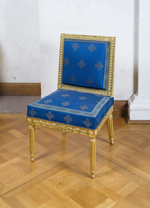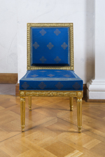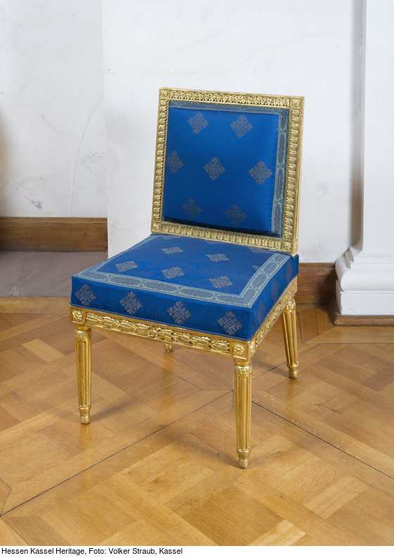 Kannelierte, nach unten konisch zulaufende Rundbeine mit abgesetzten gerundeten Füßen. Am Ansatz zur Zarge eingezogen und mit Blattfries verziert. Die Hinterbeine leicht ausgestellt. Gerade Zarge mit aufgelegtem Lorbeerrankenfries, auf der Vorderseite durch Schleife verbunden. Am Ansatz der Beine quadratisch gerahmte Rosetten. Leicht trapezförmige Sitzfläche und hohe rechteckige Rückenlehne. Rahmen der Rückenlehne mit stilisiertem Blattfries, die Ecken durch gerahmte Rosetten betont. Sitz und Rückenlehne gepolstert, Polsterung des Sitzes hoch und kantig. Bezug blaue Seide mit eingewebtem Muster in Silberfäden: Auf Eck gestelltes Quadrat mit stark stilisierten pflanzlichen Formen. Blau-graue Borte mit stark stilisiertem Blattmotiv. Rückseite der Rückenlehne mit hellblauer Seide bezogen. Auf der Unterseite Aufschrift: Carl Grahn No. 2