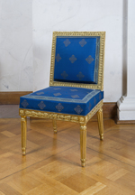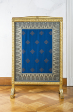 Rotbuche, gedrechselt und geschnitzt, kreidegrundiert, auf gelbem und rotem Poliment Matt- und Glanzvergoldung, Rückseite gelb gefaßt, gepolstert, Seide, dunkelblau mit Webmotiv in Silberfäden, Seide, hellblau, Borte, blau-grau mit grauem Muster. |