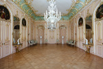 Buchenholzgestell, Oberflächenbehandlung: blaugrau gestrichen, Schnitzereien und Kanten vergoldet. |