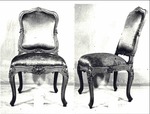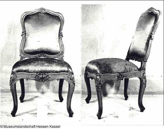 Sitz und Rückenlehne eingesetzt, Rückenlehne und Sitz gepolstert, Schnitzerei an allen Holzteilen.