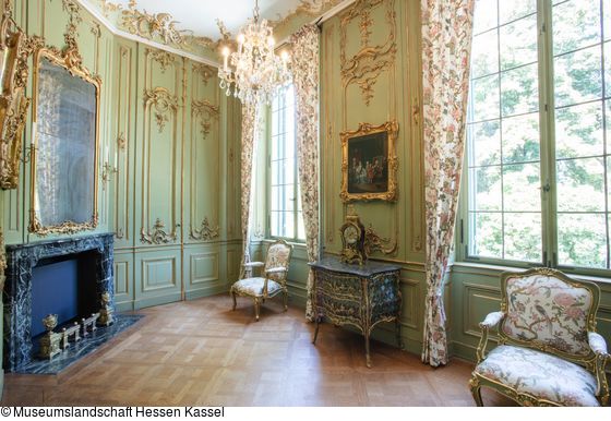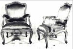 Buchenholzgestell, Rückenlehne und Sitz eingesetzt, Sitzfläche, Rückenlehne und beide Armlehnen gepolstert, Schnitzereien an allen Holzteilen. Schnitzereien und Kanten vergoldet. Bezug: weißgrundig, Druckmotiv mit Vögeln auf Zweigen und Blüten in chinoisen Formen.