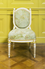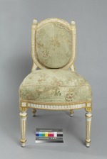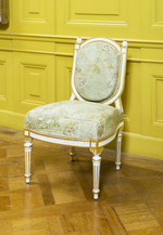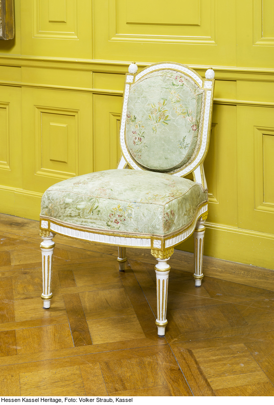 Weiß-gold gefaßter Stuhl. Kannelierte, nach unten konisch zulaufende Rundbeine mit ringförmig abgesetzter Fußzone. Am Zargenansatz eingezogen, darüber kantiges Zwischenstück mit aufgelegten breiten Schuppenband. Geschwungene Zarge, das Feld zwischen den Randleisten kanneliert, die vorderen Ecken mit Rosetten in gerahmten Feldern. Geschwungene, gepolsterte Sitzfläche. Annähernd ovale, gepolsterte Rückenlehne, der Rahmen mit Schuppenfries, die beiden oberen Ecken mit Rosetten in gerahmten Feldern. Zwei Aufsätze in blattbelegter Knaufform. Bezug grüner, gerippter Seidenstoff mit floraler Stickerei und rankenförmigem Rautenmuster. Bezug der Lehnenrückseite blaue Seide. Gewellte Gimpe in Beige, gedrehte Kordel in weiß-rosa.