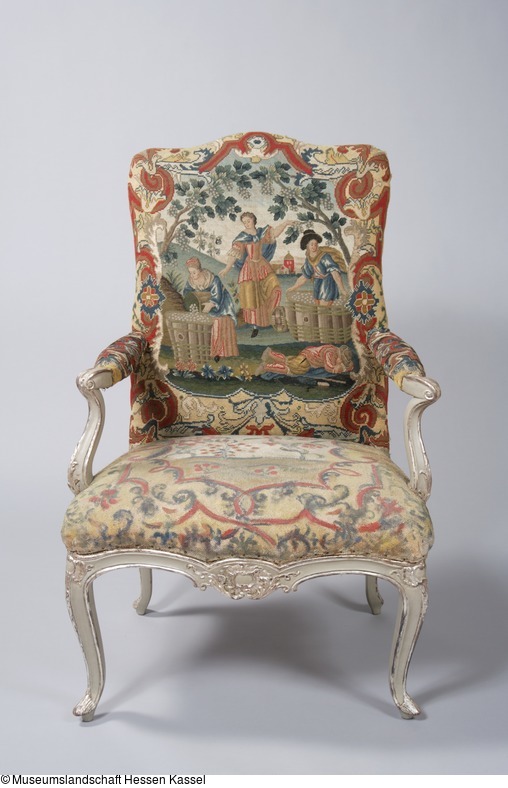 Die Kartusche auf der Sitzfläche in Bandelwerk mit Schleifen; darin große Blumen. Diese Fläche nicht gestickt, sondern 1971 von Schwertle in Weilburg auf Rupfen gemalt. Die Kartusche auf der Lehne über die ganze Breite der Lehne gespannt in breitrandiger Bandelwerksbegrenzung. Darin eine Winzerszene unter einer Weinlaube. Drei höfische Frauen lesen Trauben, tragen sie in die Kelter, während eine dritte das Lesegut mit den Füßen stampft. Derweil schläft der ihnen zur Hilfe gestellte Winzer auf einer Wiese im Vordergrund den Rausch aus, den der Wein bringt.