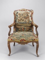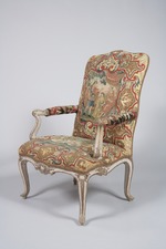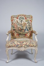 Reich geschnitzter Armlehnsessel auf vier über Eck gestellten, s-förmig geschwungenen und mit plastischem Blatt- und Knorpelwerk verzierten Beinen, die organisch in die profilierte und vorne leicht gebauchte Zarge übergehen. Die Beine zeigen Überlaubschmuck mit Mittelrippe und seitlicher Kehlung ansteigend und an der Zarge durch zierliche Rocaillekartusche über die Zarge sich ausweitend. In der Mitte der Zarge breitgezogene Rocaillekartusche. An den seitlichen Zargen Unterbrechung im vorderen Drittel durch Rocaille mit Ranke. Schnitzerei in Buchenholz mit hellgrauer Grundierung. Die Höhungen als Blattsilberauflagen auf rotem Bolus. Leicht gerundeter Polstersitz. Trapezförmiger, leicht gewölbter Polstersitz. Nach innen gebogte und nach vorn zur Seite ausgestellte Armlehnstützen wiederum mit Überlaubschmuck, Mittelrippe und seitlicher Kehlung. Kurze z.T. gepolsterte Armlehnen. Die hohe, leicht taillierte, komplett über den Rahmen gepolsterte Rückenlehne, oben mit geschweiftem Umriß, leicht nach hinten geneigt. Gelbgrundiger Stickereibezug mit großflächigem Blütenmuster und je einer Bildkartusche in Bandelwerkrahmen auf der Sitz- und Rückenfläche.