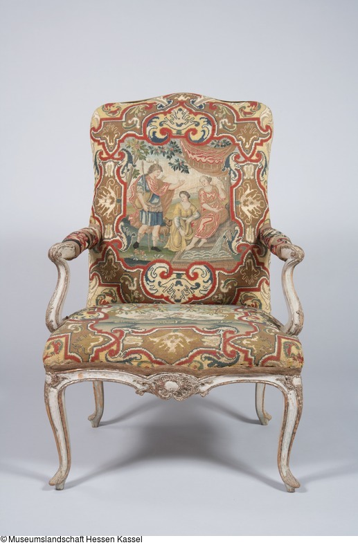 Die Kartusche auf der Sitzfläche in kräftigem Bandelwerk, darin zwei Vögel um eine Nelke balzen. Die Kartusche auf der Lehne mit mythologischer Szene: Diana und Aktäon. Die Szene zeigt simultan das ganze Geschehen. Aktäon sieht Diana unter einem Baldachin im Bad (eigentlich sieht er nur ihre Füße), während er bereits in einen Hirsch verwandelt wird. Rückseite Wollstoff: Goldgimpe (Erneuerung um 1900?).