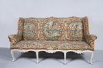 Buche geschnitzt, bemalt, versilbert. Gestickte Bezüge (Petit point). |