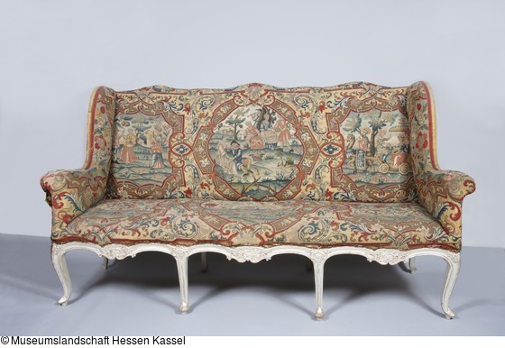Dreisitziges reich geschnitztes und gefaßtes Sofa auf acht s-förmig geschwungenen, auf der Vorderseite mit plastischem Blatt- und Rocaillewerk verzierten Beinen, die in die profilierte und vorne mehrfach gebauchte Zarge übergehen. Von den Beinen 2 nach vorne, 4 über Eck gewendet. Die nach vorne gewandten Beine zeigen Überlaubschmuck mit Mittelrippe und seitlicher Kehlung ansteigend und an der Zarge durch kleine Rocaillekartusche mit der Zarge verbunden. In den Mitten der Zargen breitgezogene Rocaillekartuschen, an den Ecken zierlich, aber scharf plastisch behandelte entsprechende Lösung. An den seitlichen Zargen Unterbrechung im vorderen Drittel durch Rocaille mit Ranke. Schnitzerei in Buche mit hellgrauer Grundierung. Die Höhungen als Blattsilberauflagen auf rotem Bolus. Leicht gerundeter Polstersitz. Nach innen gebogte und zur Seite ausgestellte Armlehnstützen die harmonisch in hohe Wangen übergehen (Ohrenbacken) und komplett mit Textilien überzogen sind. Die hohe gepolsterte Rückenlehne mit drei kleinen Schweifgiebeln bewirkt einen wellig bewegten Umriss. Gelbgrundiger Stickereibezug auf mit großflächigem Blütenmuster und je drei Bildkartuschen in Bandelwerkrahmen über der Sitz- und Rückenfläche. Die Außenflächen mit gelbem Seidendamast bespannt (auf beiden Seiten verschieden; Streifen- und Blumenmuster). Rückseite Wollstoff: Goldgimpe (Erneuerung um 1900?). Die Bilder auf der Rücklehne von links: 1) Höfisches Paar beim ''Bauerntanz'' auf einer Wiese unter einem Birnbaum; dazu eine Harfenistin mit (indianischen?) Blumenkopfputz. 2) Fête de la champêtre in einer Landschaft am Wasser. Vorne links ein Paar, sich kosend. Vor einem Baum zwei Frauen sitzend, die eine den Hund streichelnd, die andere erhält von einem Herrn rechts einen Korb mit Brot oder Kreuzkäse. Dahinter ein flötespielender ''Hirte''. Die Herren mit roten Absätzen an den höfischen Schuhen. 3) Grotesker Wagen von einem Kamel gezogen, das eine blau-silberne Schabracke trägt. Neben ihm geht ein Flötenspieler mit einer indianischen(?) Kopfbedeckung. Im Wagen sitzt unter einem von hinten gehaltenen Baldachin eine Dame mit Laute. Der Kutscher, ein Harlekin, hat sich von seiner Aufgabe abgewandt und hält der Dame dirigierend ein Notenblatt vor. Dahinter ein Baum mit roten Früchten. Alle Bilder können einzeln oder auch als durchlaufende Gesamtheit betrachtet werden. Die Bildreihe auf der Sitzfläche zeigt jeweils inmitten riesiger Blumen 1) Zwei Vögel rote Früchte von einem Baum pickend. 2) Ein männlicher Pfau, vor zwei Weibchen sein Rad schlagend. 3) Zwei Vögel vor Büschen mit roten und weißen Früchten.