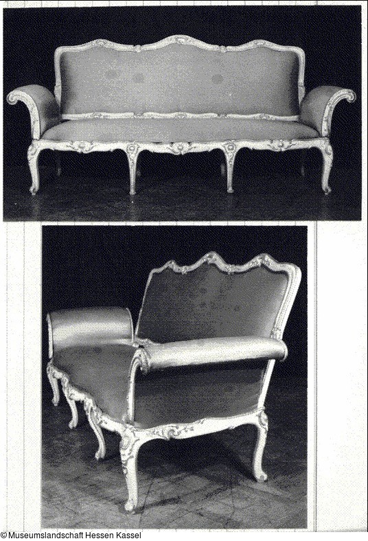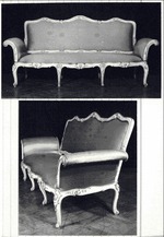 Rückenlehne und Sitz eingesetzt, Rückenlehne, beide Armlehnen und Sitzfläche gepolstert, Bezüge aus rosa Seide, Schnitzereien an allen Holzteilen.