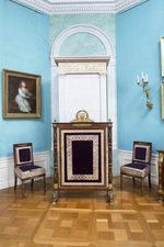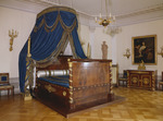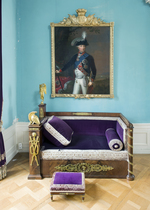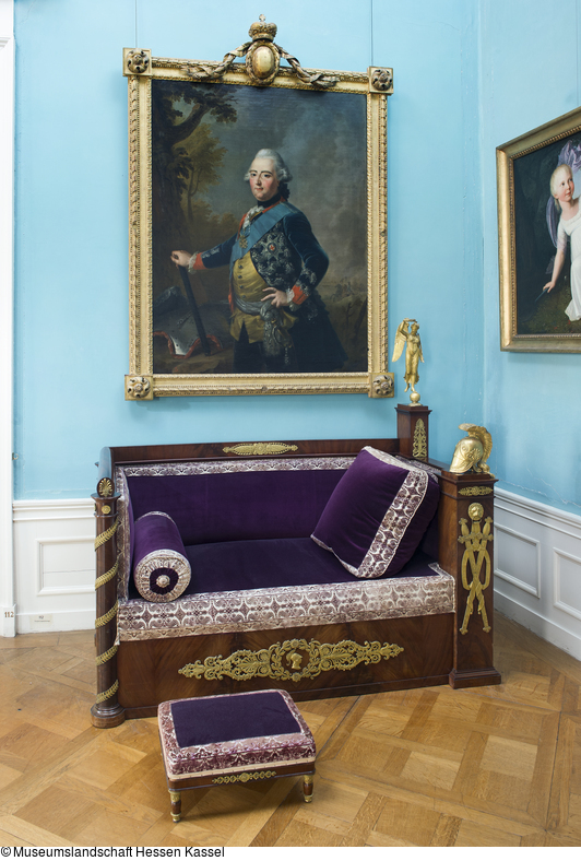 Bemerkung: Die zum Ruhesofa gehörende Sitzgruppe stand ab 1823 im Mittelbau von Schloß Wilhelmshöhe, Bel Étage, südliches Schlafzimmer. Nach Auftrag Kurfürst Wilhelm II. lieferte Johann Conrad Bromeis den Entwurf, die Ausführung erfolgte durch den Kasseler Schreinermeister Justus Siebrecht und Johann Christian Ruhl; Vergoldung des Helms von Georg Grahn. Den Stoff bezog man aus Lyon, die vergoldeten Bronzen kamen aus Paris. Der Polsterbezug wurde 1978/79 unter Wiederverwendung der alten Borten erneuert. Zusammengehörige Sitzgruppe: 2.1.2334 - 2.1.2338, 2.1.2423 - 2.1.2429, 2.4.192 - 193, 2.7.563, 2.7.569, 2.7.599, 2.7.600 und 2.7.604.