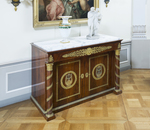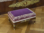 Mahagoni massiv und auf Blindholz Eiche furniert. Fichte. Linde, geschnitzt, gefaßt und vergoldet. Kupferlegierung. Matt- und Glanzvergoldung. Violettfarbener Samt, z.T. Reliefsamt. Kordelzier. |