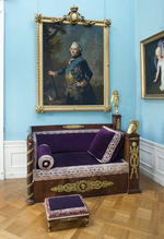 Kastenartiges Ruhesofa mit Kissen und Rolle. Niedrige Sockelzone und hohe Zarge, mittig mehrteilige vergoldete Bronzeapplikation: im Zentrum Feldherrnkopf im Profil nach rechts umgeben von Lorbeerblattzweigen mit Rosettenenden. Seitlich schließen sich je eine große Palmette mit Ranken- und Akanthusblattwerk an. Die auf den Innenseiten gepolsterten Seitenlehnen sind unterschiedlich gestaltet. Rechts bilden zwei Pfeiler, links zwei Säulen die Seitenlehnholme. Den Pfeiler vorne rechts bekrönt ein geschnitzter und vergoldeter Helm mit Federbusch. Darunter auf Front und linker Seite je eine Rosette mit Palmettenpaar. Auf der Pfeilerfront Bronzeapplikation mit zwei gekreuzten Schwertern, die scheinbar an einem Löwenmaskaron hängen. Der erhöhte hintere Pfeiler, den auf der Front eine bronzene Palmette mit Akanthusblattwerk ziert, wird von einer auf einer Kugel stehenden Viktoria bekrönt. In den Händen hält sie Palmwedel und Kranz. Die vordere Säule links mit spiralförmig appliziertem Blattzweig aus vergoldeter Bronze. Auf der abgesetzten Kapitellzone zwei Rosetten. Die Seitenlehne links schließt nach oben mit einem Rundstab in hochovaler Querschnittform ab. Auf der Front applizierte Palmette. Die gepolsterte, leicht nach hinten gerundete Rückenlehne schließt oben in Höhe der linken Seitenlehne ab, mittig Rosette flankiert von zapfenartigem Blattwerk. Bezug aus violettfarbenem Samt mit vegetabil gemusterten Borten in Cremeweiß und Violett.