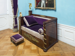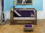 Kastenartiges Ruhesofa mit Kissen und Rolle. Niedrige Sockelzone und hohe Zarge, mittig mehrteilige vergoldete Bronzeapplikation: im Zentrum Feldherrnkopf im Profil nach rechts, umgeben von Lorbeerblattzweigen mit Rosettenenden. Seitlich schließen sich je eine große Palmette mit Ranken- und Akanthusblattwerk an. Die auf den Innenseiten gepolsterten Seitenlehnen sind unterschiedlich gestaltet. Links bilden zwei Pfeiler, rechts zwei Säulen die Seitenlehnholme. Den Pfeiler vorne links bekrönt ein geschnitzter und vergoldeter Helm mit Federbusch. Darunter auf Front und linker Seite je eine Rosette mit Palmettenpaar. Auf der Pfeilerfront Bronzeapplikation mit zwei gekreuzten Schwertern, die scheinbar an einem Löwenmaskaron hängen. Der erhöhte hintere Pfeiler, den auf der Front eine bronzene Palmette mit Akanthusblattwerk ziert, wird von einer auf einer Kugel stehenden Viktoria bekrönt. In den Händen hält sie Palmwedel und Kranz. Die vordere Säule rechts mit spiralförmig appliziertem Blattzweig aus vergoldeter Bronze. Auf der abgesetzten Kapitellzone zwei Rosetten. Die Seitenlehne rechts schließt nach oben mit einem Rundstab in hochovaler Querschnittform ab. Auf der Front applizierte Palmette. Die gepolsterte, leicht nach hinten gerundete Rückenlehne schließt oben in Höhe der rechten Seitenlehne ab, mittig Rosette flankiert von zapfenartigem Blattwerk. Bezug aus violettfarbenem Samt mit vegetabil gemusterten Borten in Cremeweiß und Violett.