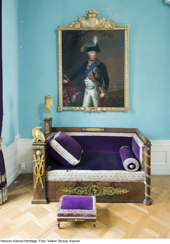 Bemerkung: Die zum Ruhesofa gehörende Sitzgruppe stand ab 1823 im Mittelbau von Schloß Wilhelmshöhe, Bel Étage, südliches Schlafzimmer. Nach Auftrag Kurfürst Wilhelm II. lieferte Johann Conrad Bromeis den Entwurf, die Ausführung erfolgte durch den Kasseler Schreinermeister Justus Siebrecht und Johann Christian Ruhl; Vergoldung des Helms von Georg Grahn. Den Stoff bezog man aus Lyon, die vergoldeten Bronzen kamen aus Paris. Der Polsterbezug wurde 1978/79 unter Wiederverwendung der alten Borten erneuert. Zusammengehörige Sitzgruppe: SM 2.1.2334 - 2.1.2338, 2.1.2423 - 2.1.2429, 2.4.192 - 193, 2.7.563, 2.7.569, 2.7.599, 2.7.600 und 2.7.604.
