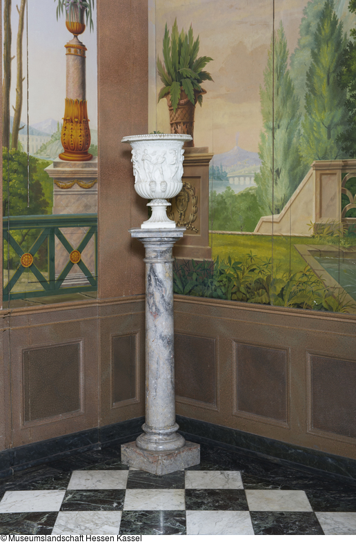 Postament in Säulenform auf quadratischem Sockel. Profilierte, gekehlte Basis, glatter, sich nach oben verjüngender Schaft und profiliertes, durch einen Wulstring abgesetztes Kapitell. Vorkragende, quadratische Deckplatte mit einfachem, steigendem Karnies und gerundeten Kanten.