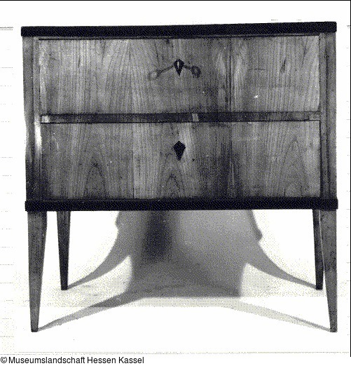 Vier Beine auf quadratischem Grundriß, nach unten verjüngt. Unten u. oben Abschlußstreifen in geschwärztem Holz. Zwei Schubladen. Schlüssellöcher von spieldrachenförmigen geschwärztem Schild umgeben.