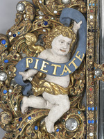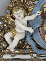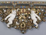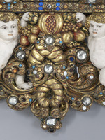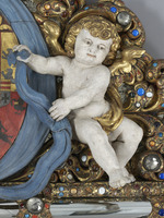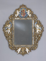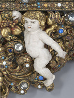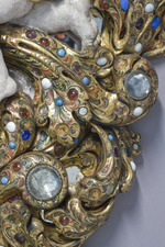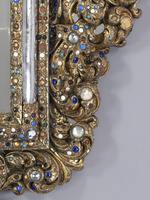 Nadelholz, Linde, polimentvergoldet, schwarz und farbig konturiert, Farbfassung, Glassteine, Spiegelglas