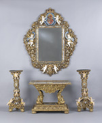 Vermutlich wurde die Triade aus verschiedenen, älteren Stücken zusammenkomponiert. Bei Wandspiegel und Tisch handelt es sich offenbar um ehemals in eine Wanddekoration eingelassene Spiegelflächen. Die Schnitzereien der beiden Guéridons greifen Motive sowohl des Spiegels als auch des Tisches auf, unterscheiden sich in der Ausführung aber deutlich von der Qualitität der erstgenannten beiden Möbel.