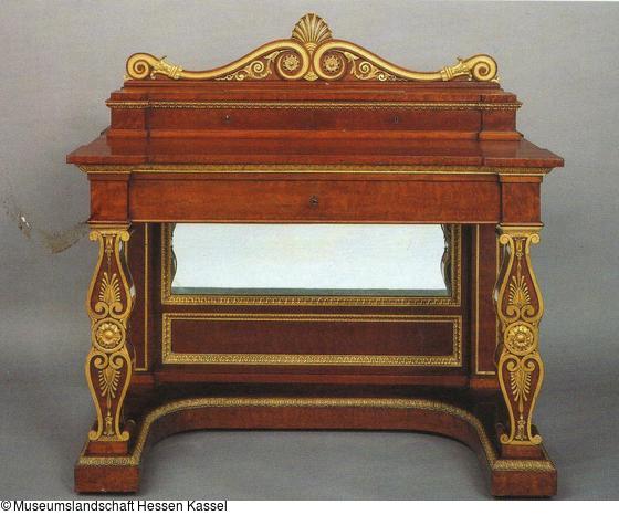 Möglicherweise gehörte der Ankleidetisch zur Ausstattung von Windsor Castle (freundliche Mitteilung von Hugh Roberts, The Royal Collection, London). Der Spiegel, der die Füllung der unteren Rückfront bildet, kann emporgezogen und schräggestellt werden.