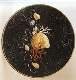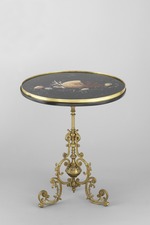 ´Pietre dure´ werden die in dem sogenannten Florentiner Mosaik gebrauchten "harten" Halbedelsteine genannt. Die geschliffenen, eingelegten und polierten Steinplatten konnten und sollten in ihren besten Beispielen wie gemalt wirken. Ihre Blütezeit erfuhr das ´Comesso in pietre dure´ im Florenz des 16. und 17. Jahrhunderts. Die hier von Francesco de Medici 1558 gegründete Manufaktur arbeitet noch heute. Die um 1830 entstandene Tischplatte könnte als Souvenir einer Italienreise oder durch einen Händler nach Deutschland gelangt und hier mit dem Metallfuß im Geschmack des Zweiten Rokoko versehen worden sein.