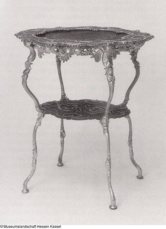 Eisenguß, Tischbeine und Zarge ursprünglich geschwärzt, später silberbronziert, die beiden Platten geschliffen, Oberflächen vernickelt, in vielen Teilen gegossen, verschraubt. |